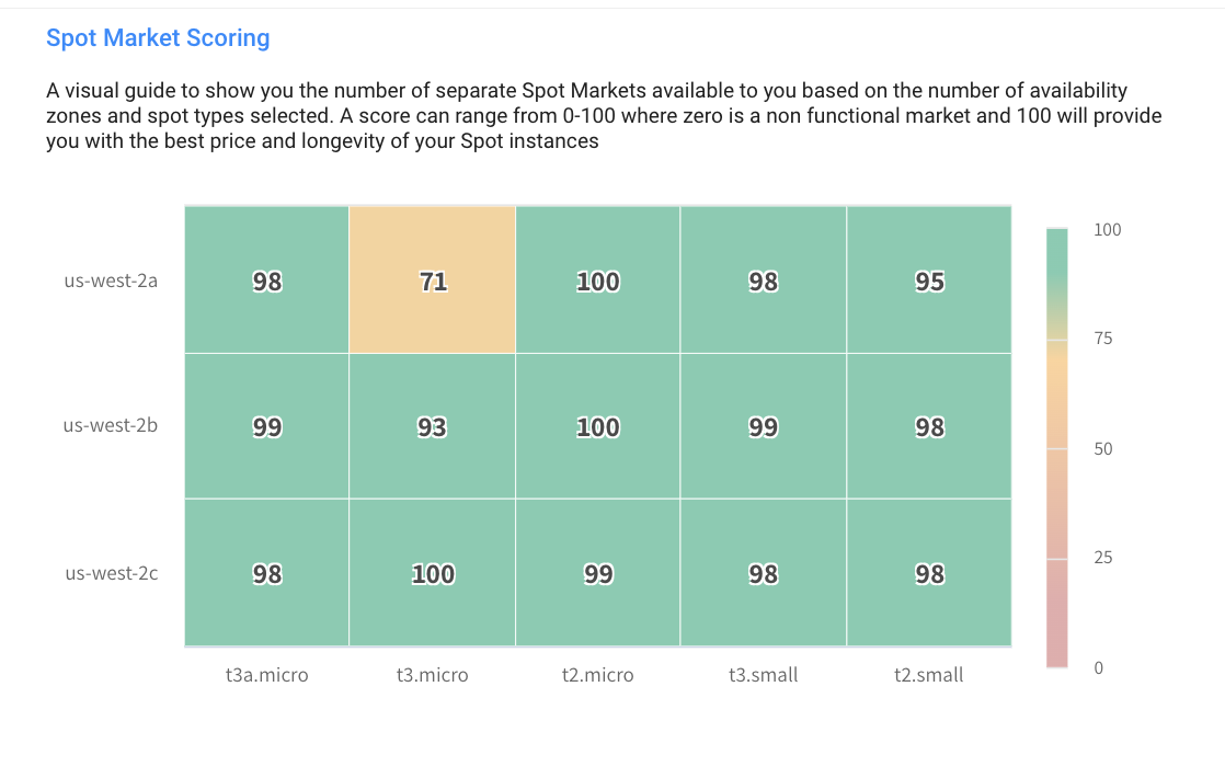 Once VPC, Subnets, Product, Image and Preferred Node type are selected, Spot will automatically preselect optional similar Spot Markets to ensure optimized cost efficiency. The Spot Market Scoring Table on the right will be populated: